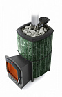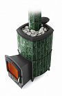 Модификация в ламелях из натурального камня, с чугунной дверцей и большим светопрозрачным экраном, с закрытой каменкой без дымохода в комплекте