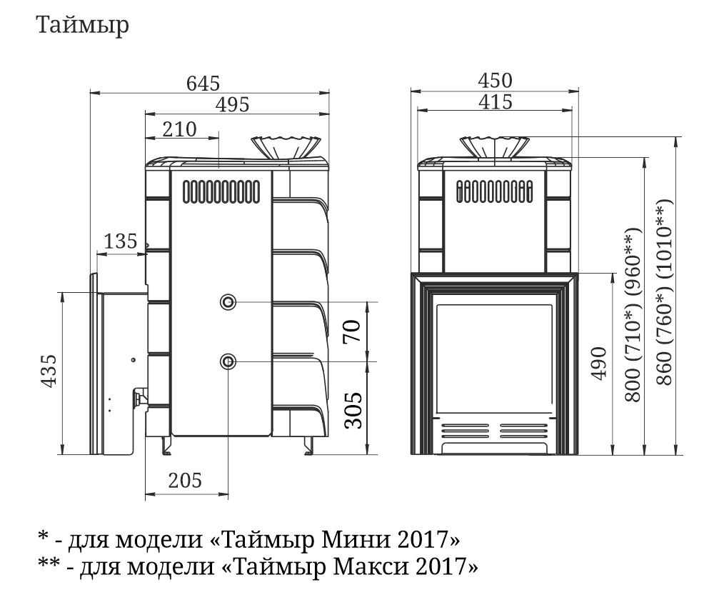 Принцип работы печи «Таймыр Макси 2017 Inox» соответствует модели «Таймыр 2017». Различие между моделями заключаются в габаритных размерах, дизайне кожуха, объеме топливника, каменки, мощности и рекомендуемом объеме парильного помещения. «Таймыр Макси 2017 Inox» предназначен для парилок 12—24 куб.м.Также как и в модели «Таймыр 2017» у новой печи уменьшена высота камеры сгорания. Что в свою очередь позволило существенно увеличить объем закрытой каменки без существенных увеличений габаритных размеров печи. Печь «Таймыр Макси 2017» лишь «подросла» на 15 см.